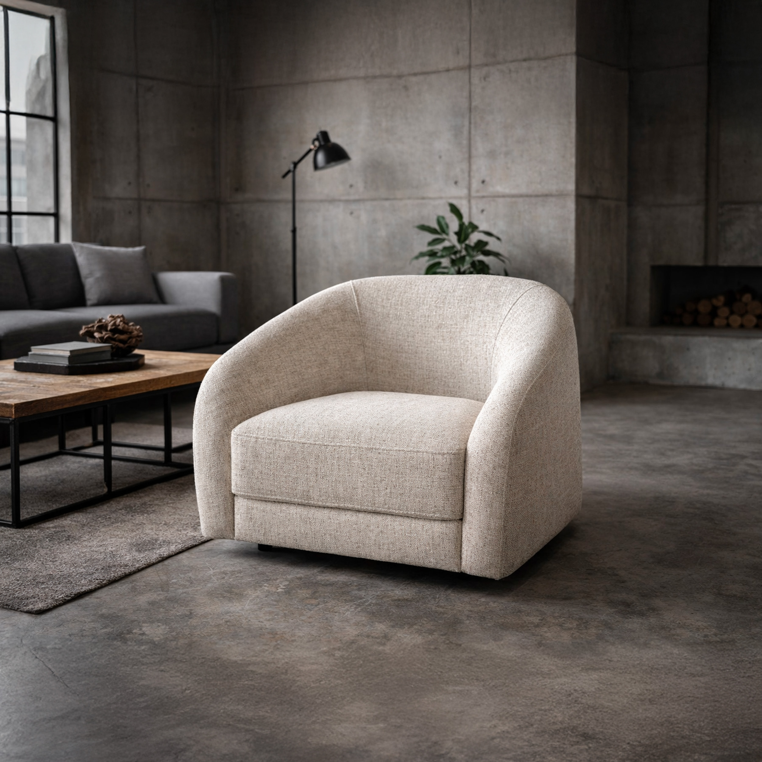 This contemporary lounge collection blends soft architectural curves with plush comfort, making it a standout choice for modern and industrial interiors alike. Upholstered in a neutral, textured fabric, each piece delivers a refined, sculptural look while remaining inviting and comfortable for everyday living.