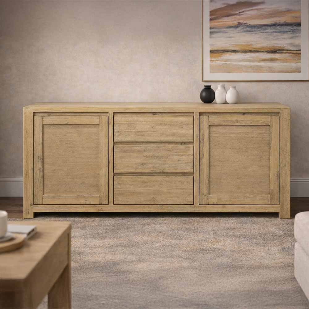 The Nelson Buffet combines natural beauty with everyday functionality. Crafted from light brushed acacia, its clean lines and subtle wood grain to even the warm tones bring a relaxed, modern-coastal feel to your home. Featuring three central drawers and two spacious cupboards, it offers generous storage for dinnerware, linens, or living room essentials. Whether styled in your dining area or lounge, the Nelson Buffet delivers timeless character and practical appeal.