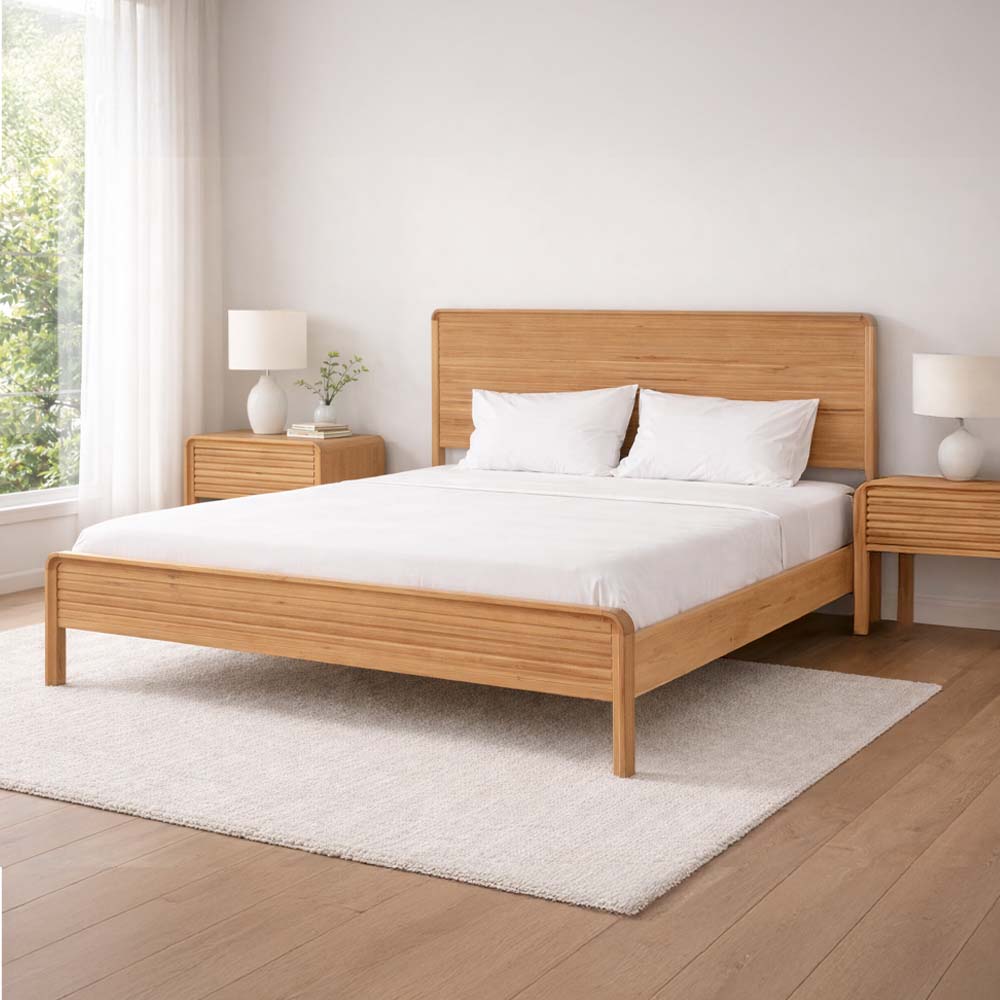 Crafted from beautifully grained Australian Messmate, the Oakland Bed blends natural warmth with refined contemporary design. Its signature horizontal slat detailing across both the headboard and footboard creates subtle texture, while the softly rounded corners give the frame a smooth, modern silhouette.