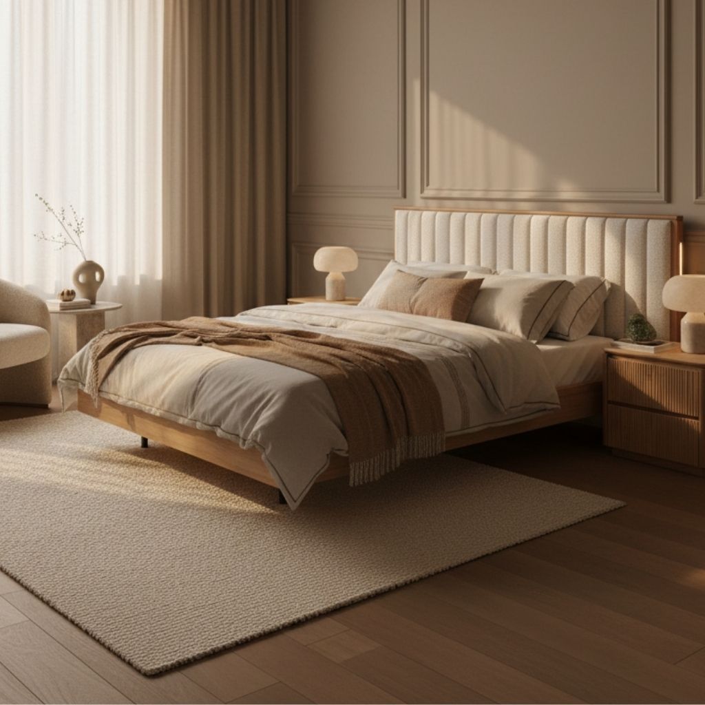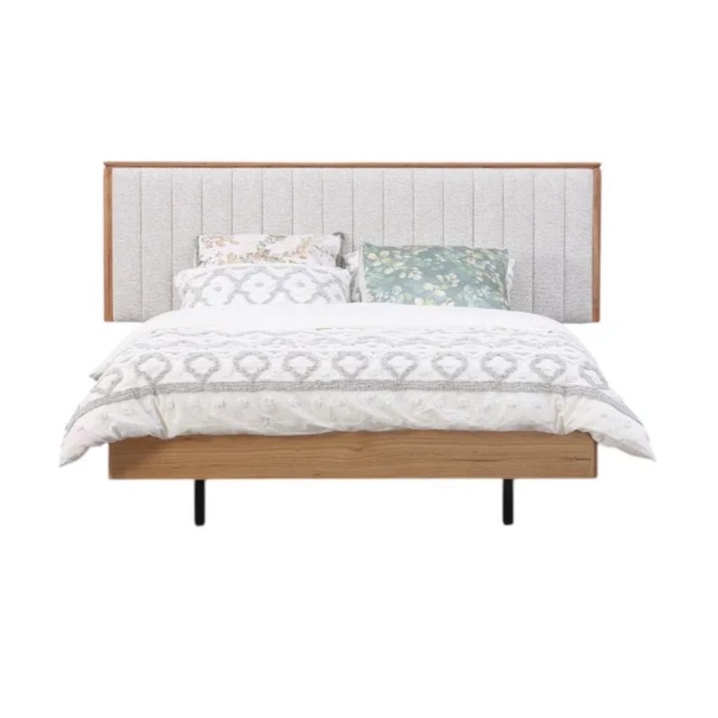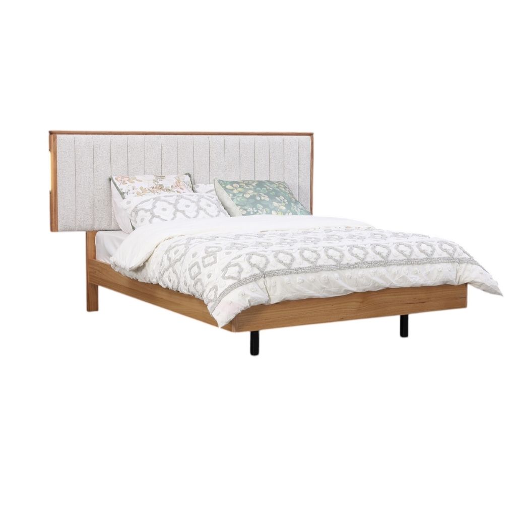The Prada Bed features a softly textured, vertical-panel upholstered headboard framed in warm timber with integrated light on each side for a convenient and modern touch.
