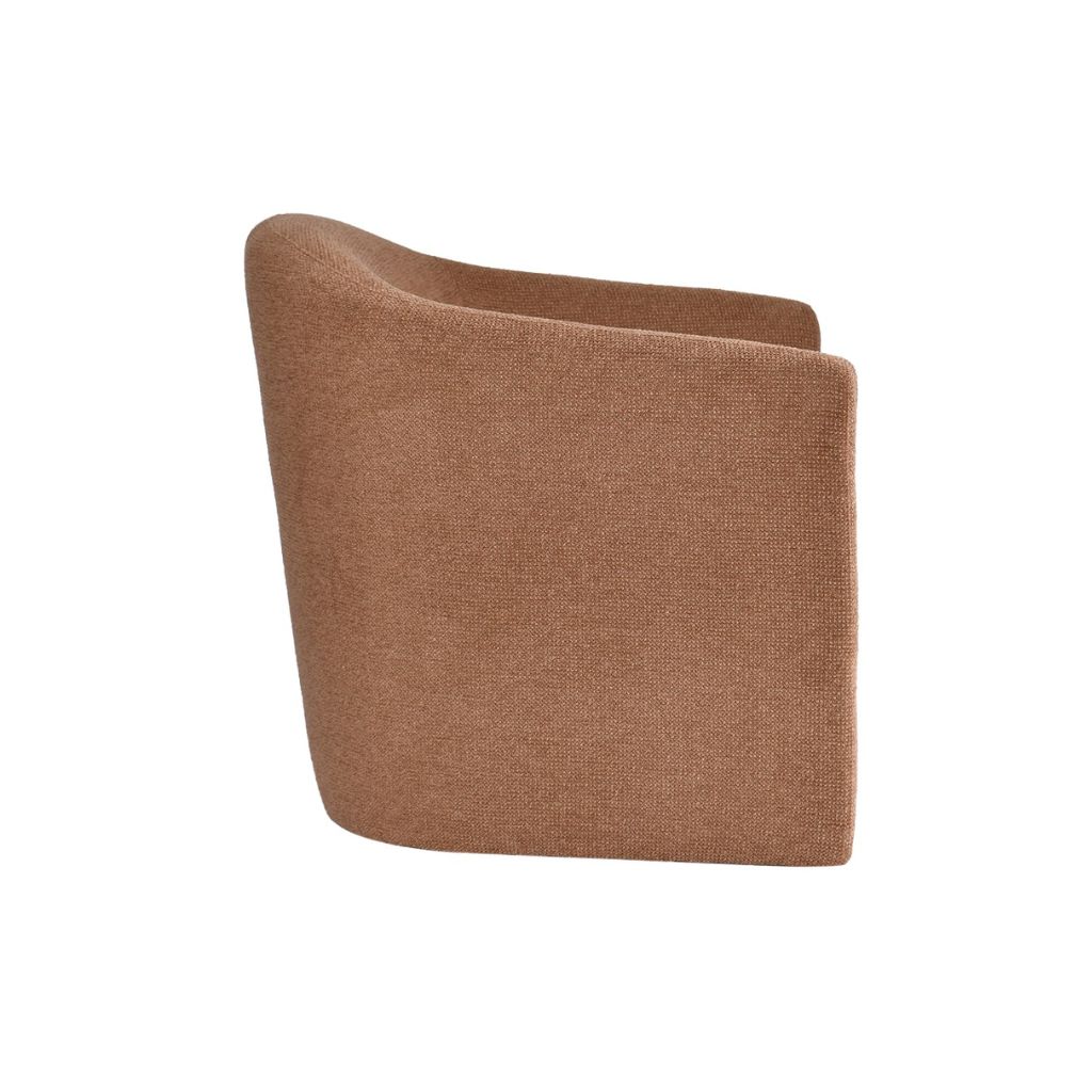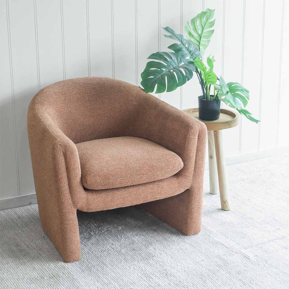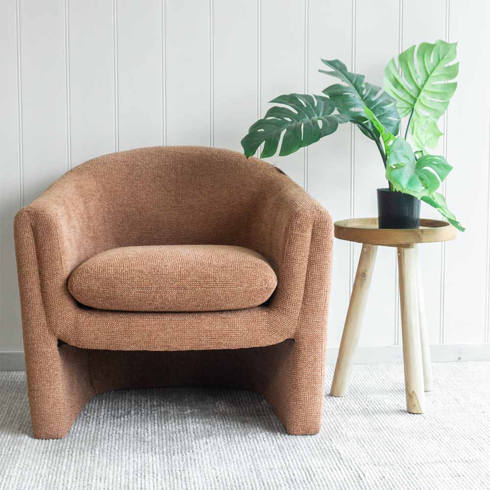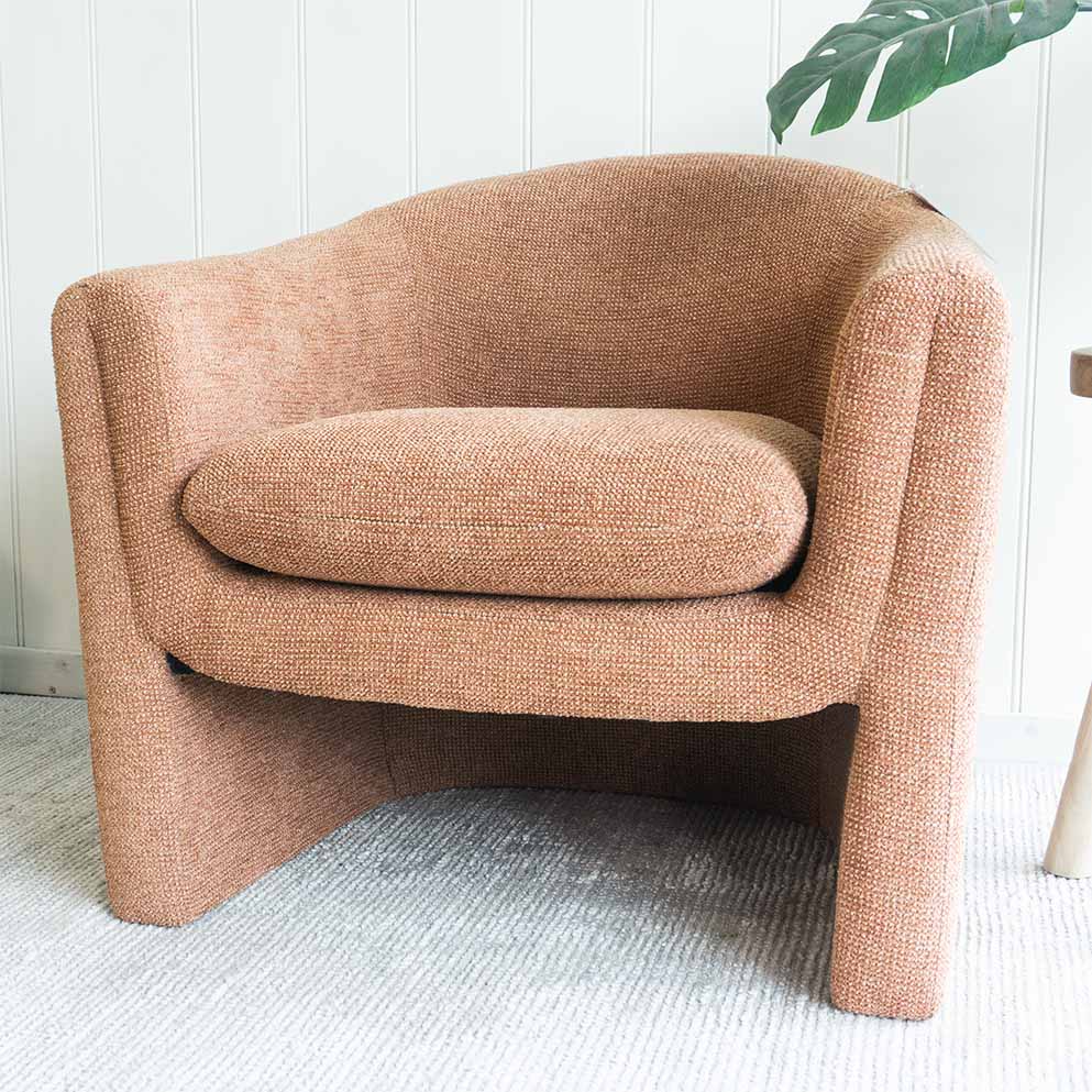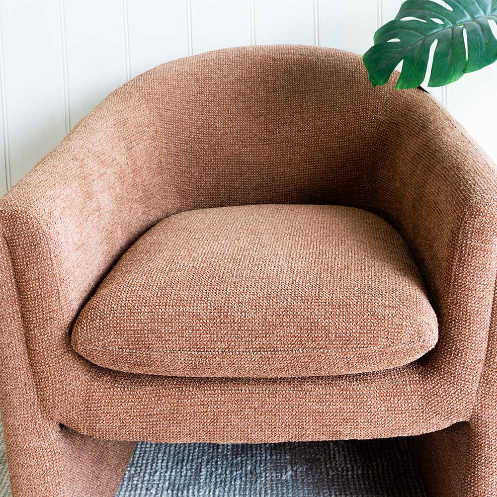 This tub chair features a low slung back, soft curves and legs with a cut-out design for that modern style. Fully upholstered in a high-performance fabric that has textured look with a soft feel. Available in two colours – Oat and Cinnamon