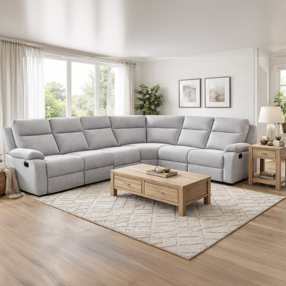 Upholstered in a soft, neutral grey fabric, the Romsey blends effortlessly into any living space while adding a clean, contemporary feel. The supportive high-back design and plush padded armrests provide exceptional comfort, while the smooth manual reclining end seats let you kick back and unwind with ease.
