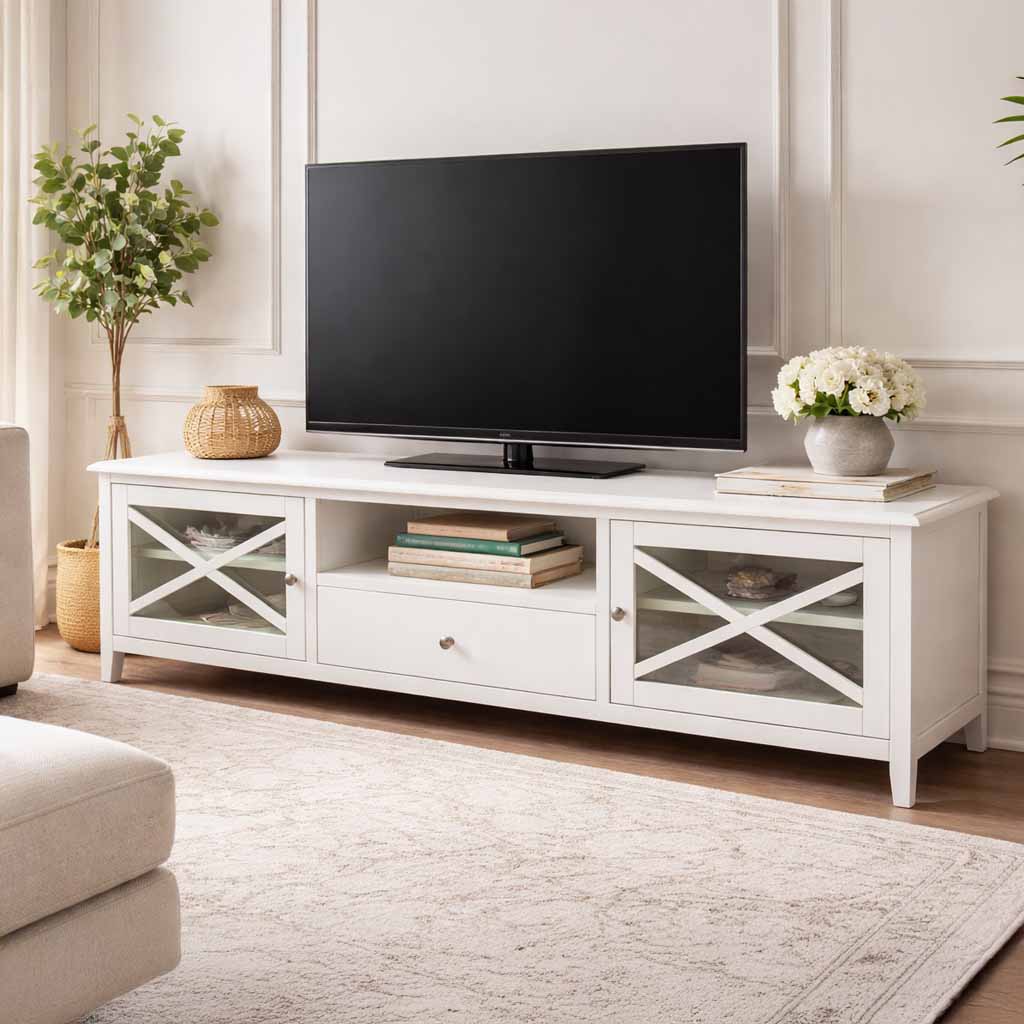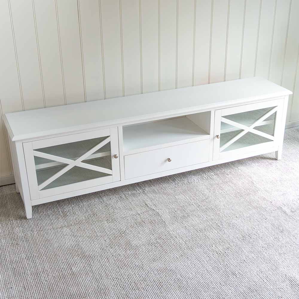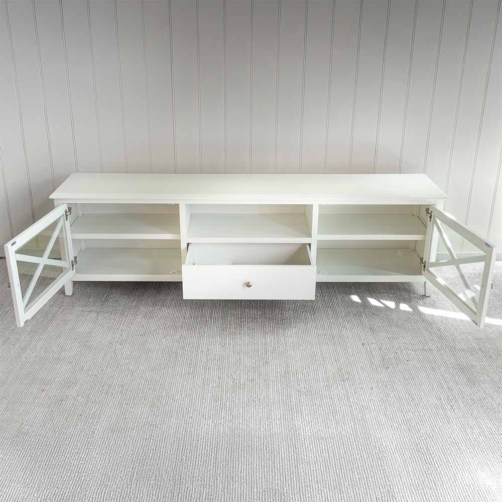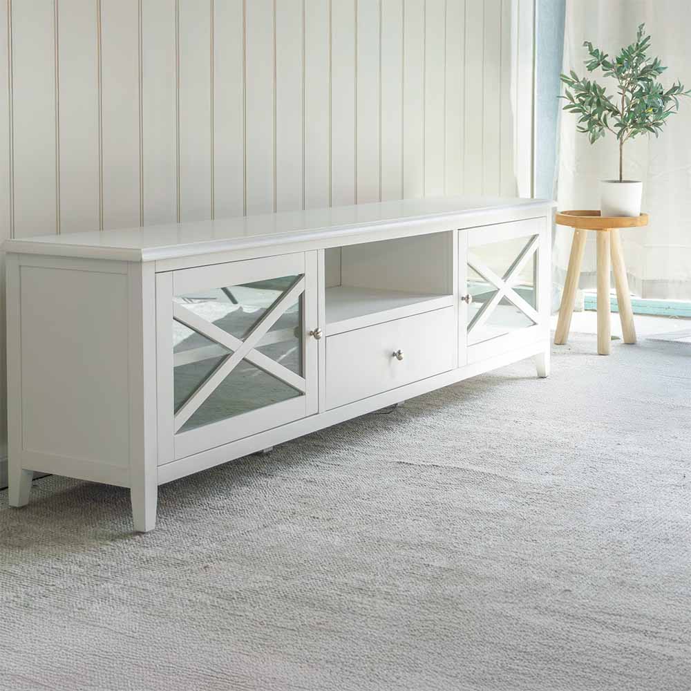 Bring timeless coastal charm to your living space with the Southampton TV Unit. Featuring a crisp white finish, cross-detailed glass doors, and a spacious drawer and shelf, it offers the perfect blend of style and storage for your entertainment needs.