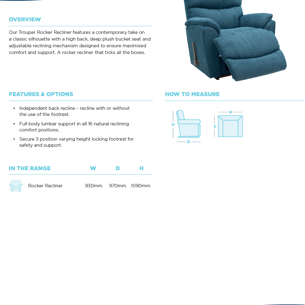 Our Trouper Rocker Recliner features a contemporary take on a classic silhouette with a high back, deep plush bucket seat and adjustable reclining mechanism designed to ensure maximised comfort and support. A rocker recliner that ticks all the boxes.